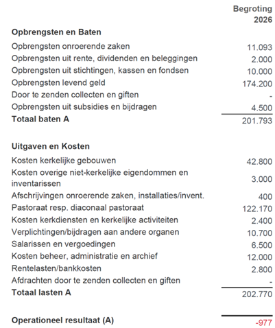 Hieronder ziet u de begroting van 2026. Voor het afgelopen jaar zijn we dankbaar voor wat we mochten ontvangen en waarmee wij de kerkelijke activiteiten konden voortzetten.